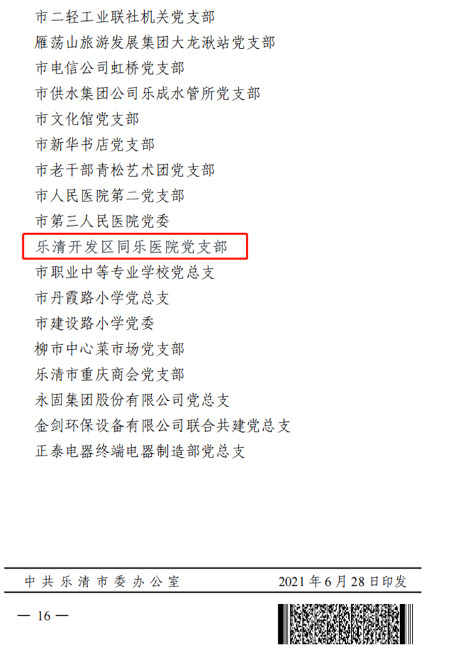 其中,我院党支部荣获“乐清市先进基层党组织”称号。